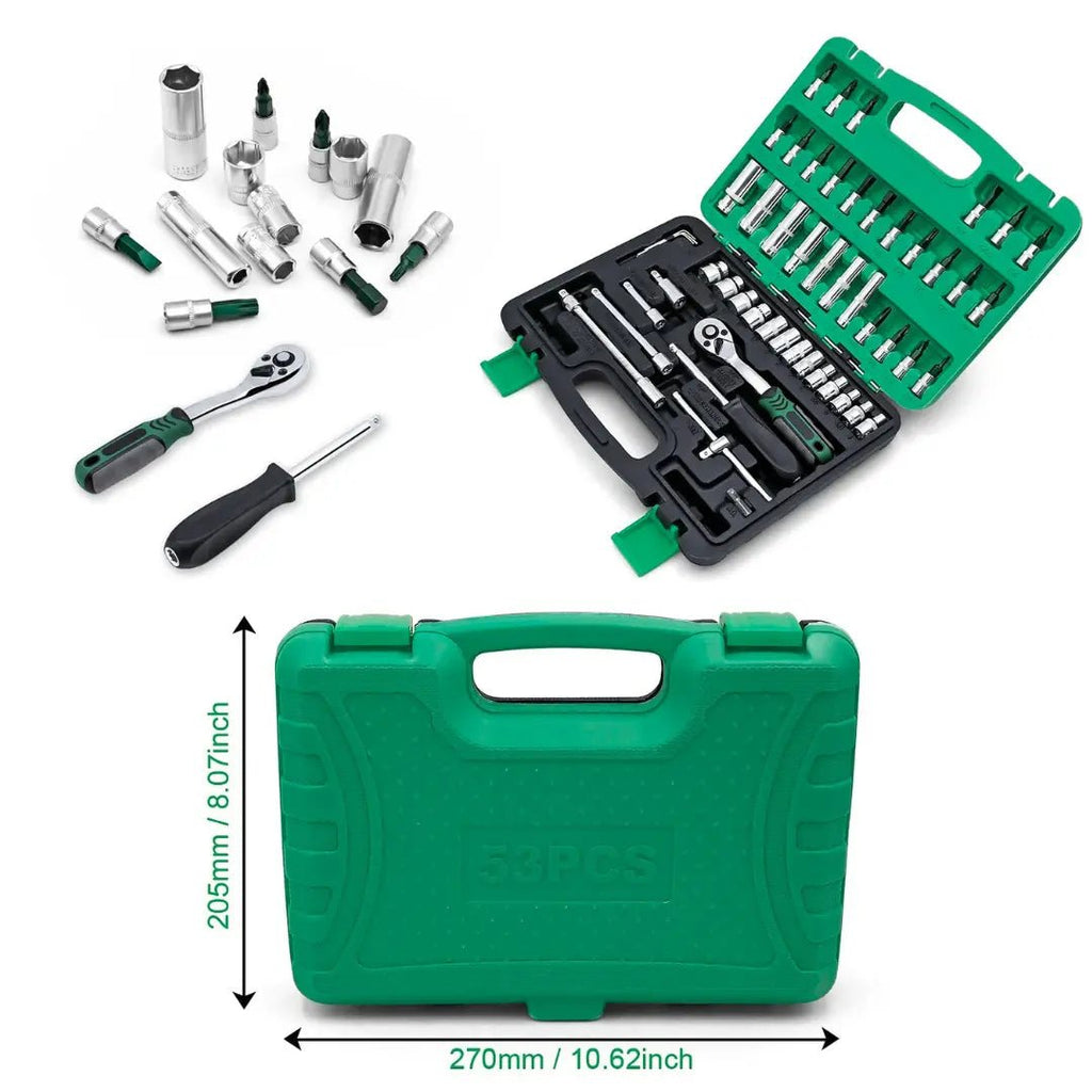 También incluye 3 tamaños de barras de extensión, 1 llave de trinquete, 1 mango giratorio, 1 junta universal, 1 barra en T deslizante, 1 adaptador de broca y 3 llaves hexagonales, junto con una funda de soplado para guardarlas todos.